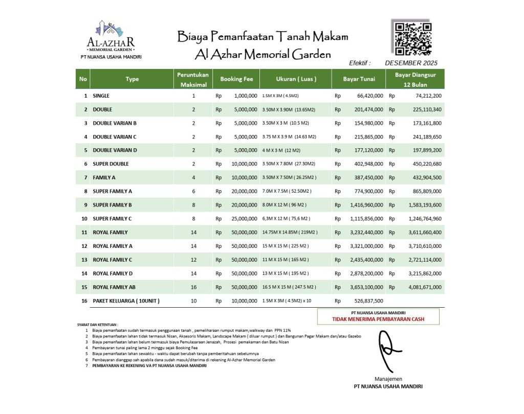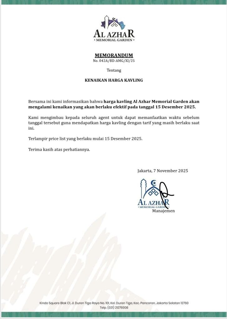 Manajemen Al Azhar Memorial Garden telah mengumumkan bahwa mulai tanggal 15 Desember 2025, nilai kavling akan mengalami penyesuaian.
